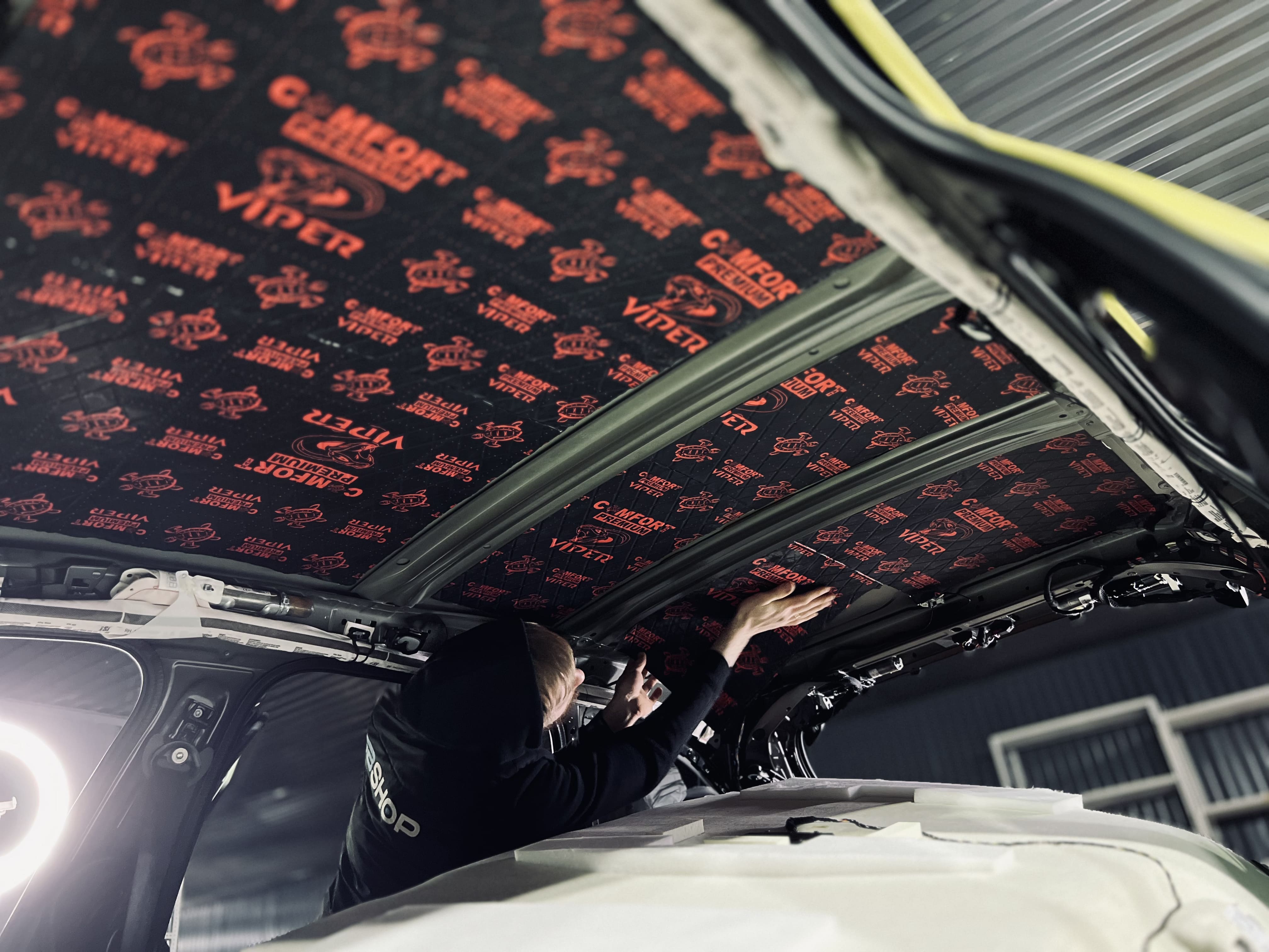 Процесс нанесения первого слоя требовал высокой точности. Первым слоем на крышу нанесли виброизоляцию Comfort Mat Viper, ультралегкий инновационный материал премиального уровня толщиной 3 мм.