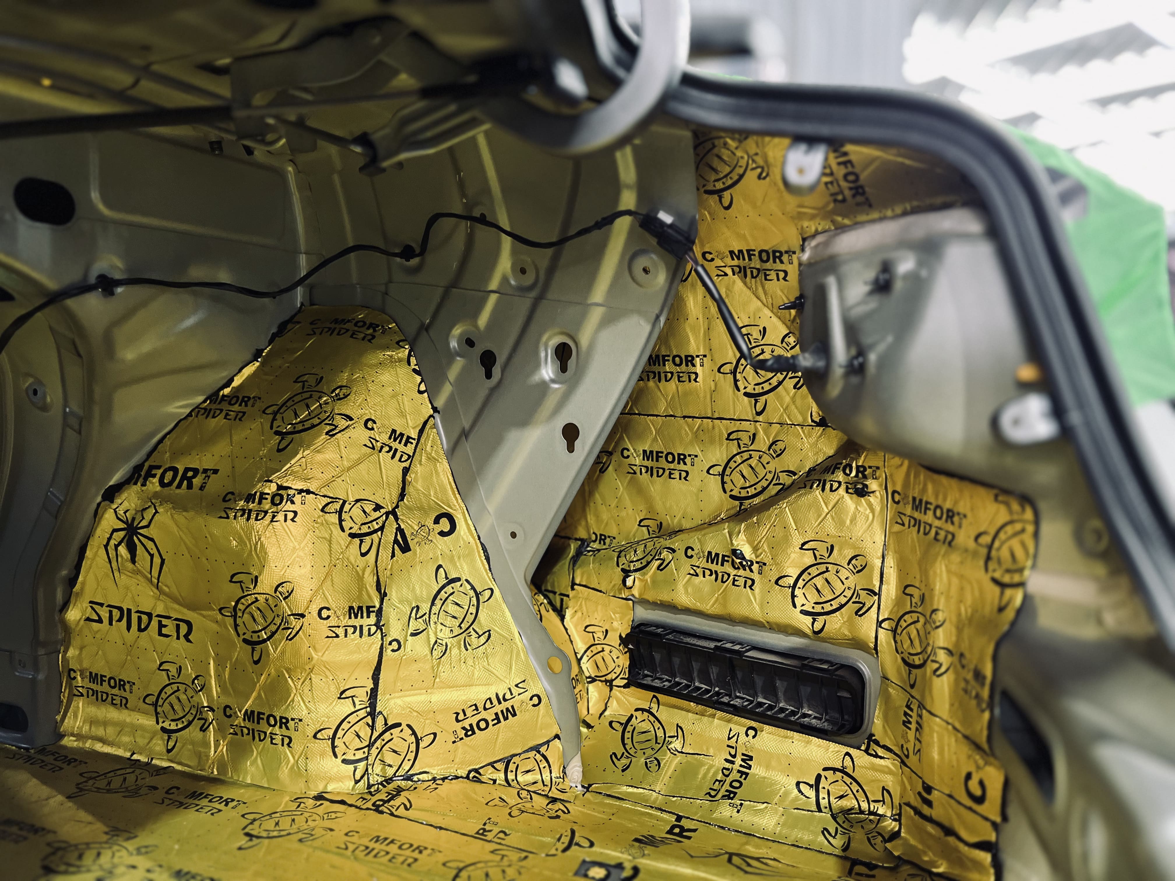 Первым слоем на двери и дверь багажника нанесли виброизоляцию Comfort Mat Vespa.
