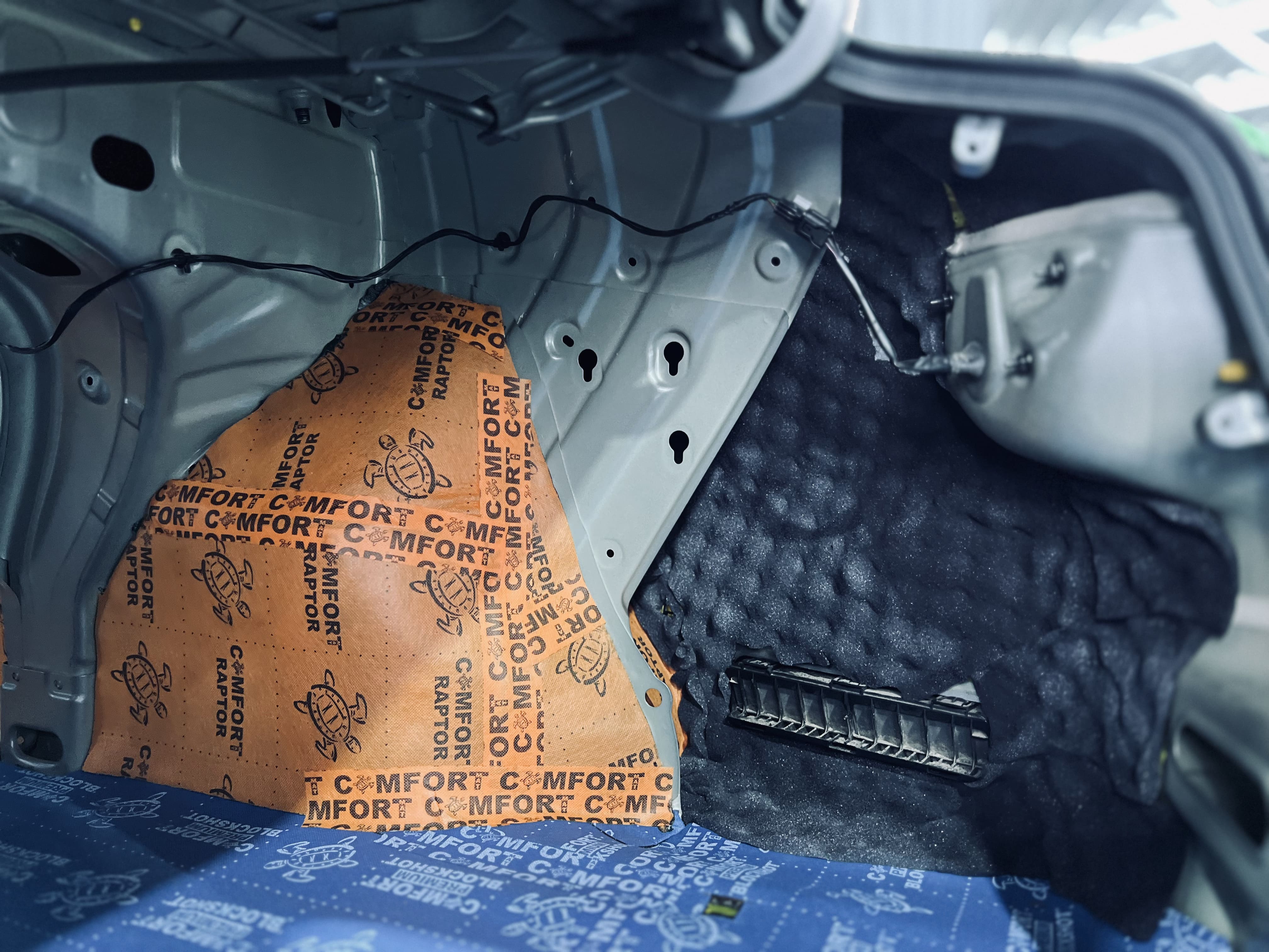 В багажнике вторым слоем на дно уложили Comfort Mat Premium BlockShot, на выступающие части над колесными арками – Comfort Mat Raptor, а на стенки – шумопоглощающие волны Comfort Mat Тишина Volna.
